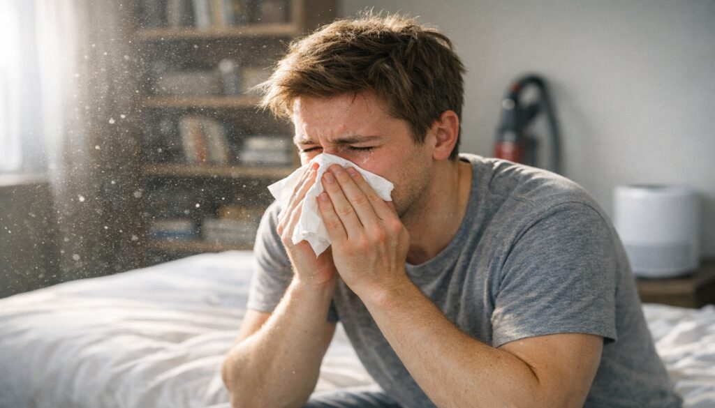 Η αλλεργία στη σκόνη οφείλεται κυρίως στα ακάρεα, μικροσκοπικούς οργανισμούς που λατρεύουν την υγρασία και τα υφάσματα. Όταν τα εισπνέεις, το ανοσοποιητικό υπεραντιδρά. Έτσι εμφανίζονται φτερνίσματα, καταρροή, βουλωμένη μύτη και κνησμός στα μάτια. Πολλοί το μπερδεύουν με «μόνιμο κρυολόγημα», με αποτέλεσμα να καθυστερούν τη σωστή διάγνωση.
