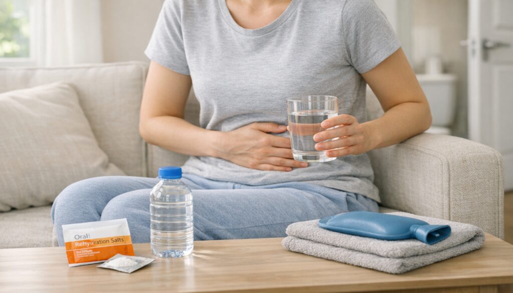 Αρχικά, σταμάτα κάθε βαριά τροφή για 3–4 ώρες και δώσε προτεραιότητα στην ενυδάτωση. Πιες μικρές γουλιές νερό συχνά, όχι μεγάλες ποσότητες μαζί. Επιπλέον, προτίμησε διαλύματα ηλεκτρολυτών από το φαρμακείο, ειδικά αν οι κενώσεις είναι πολλές. Αν κάνεις εμετό, περίμενε λίγο και ξαναδοκίμασε με πολύ μικρές ποσότητες. Απέφυγε τα κοινά αντιδιαρροϊκά φάρμακα χωρίς ιατρική συμβουλή, ιδιαίτερα αν έχεις πυρετό ή αίμα στα κόπρανα. Μπορούν να καθυστερήσουν τα μικρόβια στο έντερο και, συνεπώς, να παρατείνουν το πρόβλημα. Ρώτησε πάντα γιατρό πριν τα χρησιμοποιήσεις. Ειδικά σε ευπαθείς ομάδες, ο γιατρός καθορίζει την ασφαλή γραμμή άμυνας.