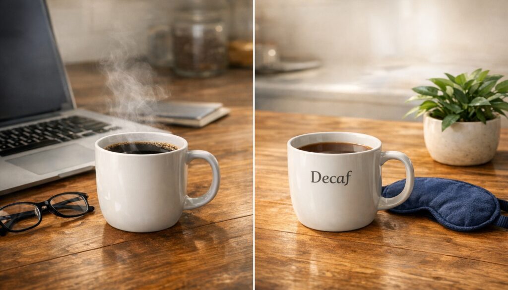 Στη συνέχεια, σκέψου τρία κριτήρια: ώρα, ευαισθησία και στόχους υγείας. Για τις πρωινές ώρες, ένας κανονικός καφές βοηθά συχνά περισσότερο στη συγκέντρωση. Μετά τις 16:00, ένα φλιτζάνι καφές χωρίς καφεΐνη προστατεύει τον ύπνο σου. Αν έχεις χρόνια πάθηση, συζήτησε τις ποσότητες με τον γιατρό σου.
