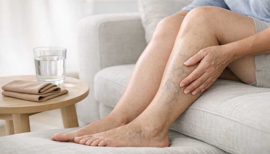 - Το βράδυ, στήριξε τα πόδια ψηλότερα από την καρδιά για 10–15 λεπτά· έτσι μειώνεις σταδιακά πρήξιμο και πόνο.