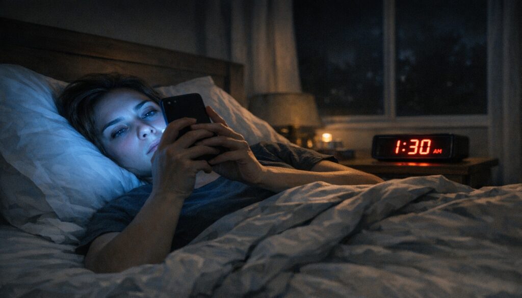 Το μπλε φως οθονών σίγουρα έχει ρόλο, αλλά δεν είναι ο μόνος «ένοχος». Επειδή σκρολάρεις σε social, ειδήσεις ή δουλειά, ο εγκέφαλος φορτώνεται με πληροφορία και ένταση. Ωστόσο, όταν ο συνδυασμός είναι μπλε φως + άγχος + συνεχές scroll, τότε το μυαλό αδυνατεί να χαλαρώσει. Ως εκ τούτου, ακόμη κι όταν τελικά κοιμηθείς, ο ύπνος δεν είναι ποιοτικός. —