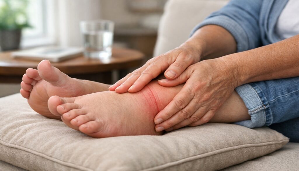 Το βράδυ, ξάπλωσε και τοποθέτησε τα πόδια σε μαξιλάρι, λίγο πιο ψηλά από την καρδιά, για 15–20 λεπτά. Έπειτα, μπορείς να κάνεις χλιαρό ποδόλουτρο και ελαφρύ μασάζ από τον αστράγαλο προς τον μηρό, πάντα με ήπιες κινήσεις. Παράλληλα, πίνε αρκετό νερό μέσα στη μέρα, γιατί η σωστή ενυδάτωση μειώνει την κατακράτηση. —