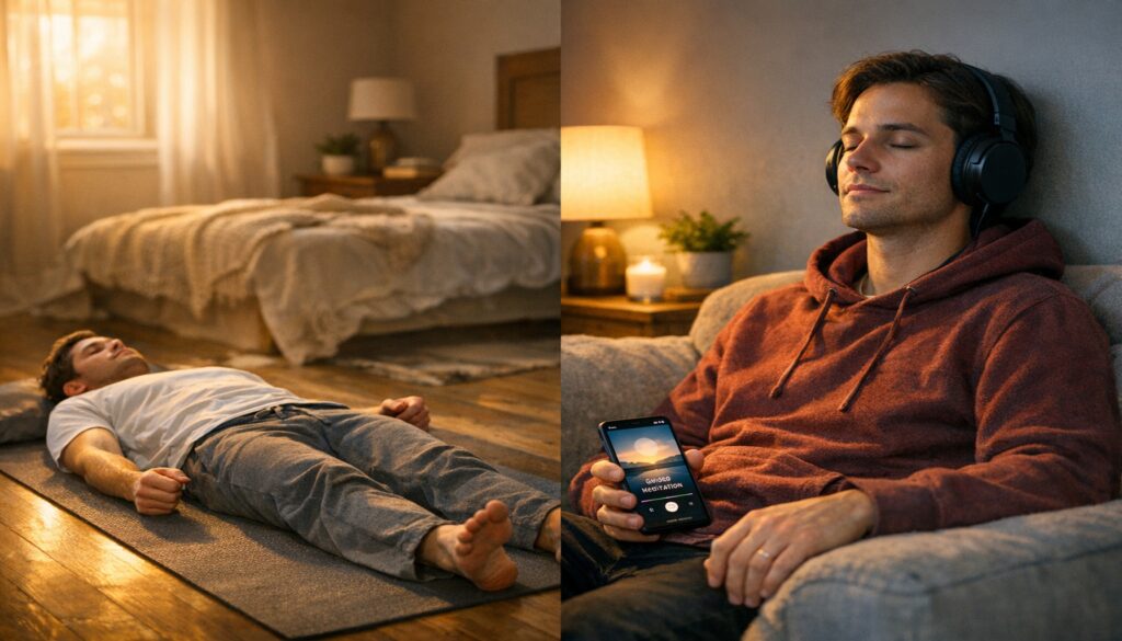 Στην πράξη, η προοδευτική μυϊκή χαλάρωση χρειάζεται λίγο χώρο αλλά καθόλου τεχνολογία. Συνεπώς, λειτουργεί υπέροχα στο κρεβάτι, στο γραφείο ή ακόμη και στο αυτοκίνητο (σταματημένο φυσικά!). Αντίθετα, ο καθοδηγούμενος διαλογισμός ταιριάζει σε ανθρώπους που αγαπούν τα ακουστικά και τις εφαρμογές. Επίσης σου δίνει δομή, αφού κάποιος άλλος «κρατάει χρόνο» για εσένα. Παρόλα αυτά, εξαρτάσαι από μπαταρία, δεδομένα και ήχο.