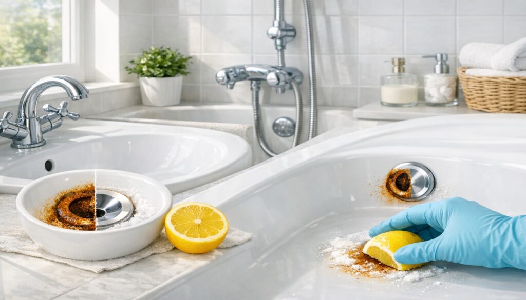 Η σκουριά στο μπάνιο συχνά υποχωρεί με πράγματα που ήδη έχεις στην κουζίνα. Αρχικά, δοκίμασε ήπιες λύσεις και μόνο αν χρειαστεί, περνάς σε πιο «βαριά» καθαριστικά.