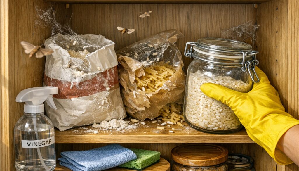 Αρχικά, έλεγξε ΟΛΑ τα τρόφιμα σε ντουλάπια και αποθήκες. Ό,τι έχει ιστούς, προνύμφες, περίεργη μυρωδιά ή αλλοιωμένη υφή, πετιέται αμέσως. Μην κρατήσεις τίποτα «γιατί είναι κρίμα», διότι θα ξαναγεμίσεις την κουζίνα με σκόρο τροφίμων πολύ γρήγορα.