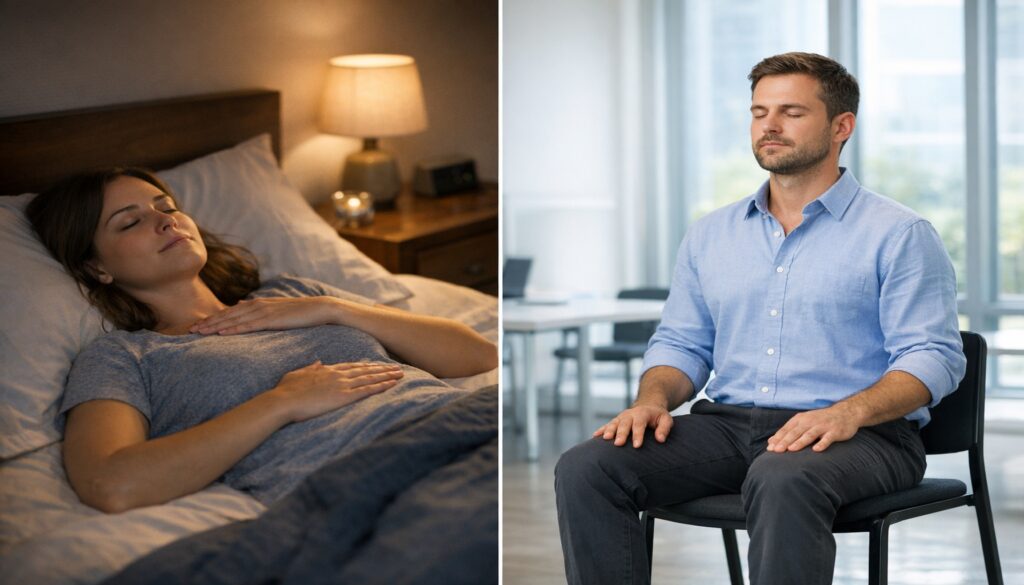 Η αναπνοή κουτιού κρατά ίσο χρόνο σε εισπνοή, κράτημα, εκπνοή και ξανά κράτημα. Έτσι δημιουργεί σταθερό ρυθμό, κάτι που βοηθά ιδιαίτερα στη συγκέντρωση. Συχνά τη χρησιμοποιούν στρατιωτικοί, αθλητές ή ομιλητές πριν από απαιτητικές εμφανίσεις, επειδή γειώνει το σώμα χωρίς να σε παρακοιμίζει. Τυπικά εφαρμόζεις 4-4-4-4: εισπνοή 4 δευτερόλεπτα, κράτημα 4, εκπνοή 4, κράτημα 4. Επίσης, μπορείς να την κάνεις διακριτικά σε meeting ή μέσα σε μέσα μεταφοράς. Ωστόσο, αν έχεις τάση για υπεραερισμό ή έντονο άγχος, ίσως χρειαστείς πιο αργό ρυθμό στην αρχή.